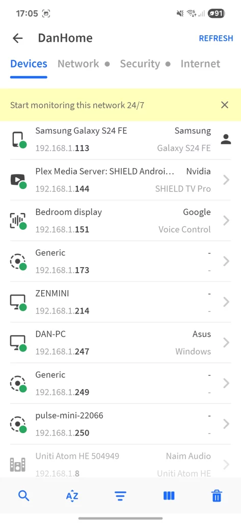Once FING is installed, open it and run a network scan by selecting Scan Current Network. The app will display a list of all devices it finds on your network. Look through the list for your Innuos system. See below example, you can see a ZENmini & PulseMini clearly visible, and on the network with a Green indicator. Devices not on the network are greyed out.