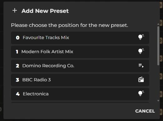 You can identify what type of music is assigned to the preset number by the corresponding icon it’s labelled with, so for example the radio icon to denote a radio preset and so on. You will know when a music source can be added to a preset by this new ‘Add to preset’ icon as seen here, highlighted in the red circle: