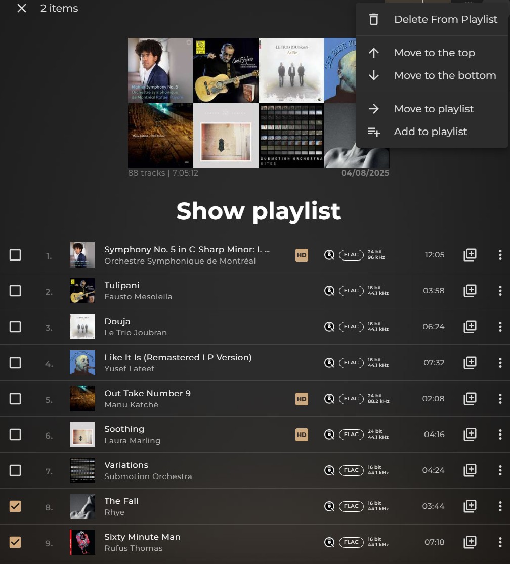 Select multiple tracks at once to delete, reorder, or move/add them to another playlist.