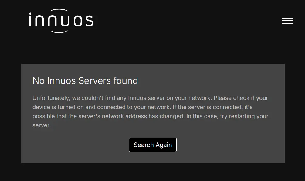 The my.innuos.com web service is a “find my server” convenience web service that makes it easy for you to find and connect to your Innuos system(s) Sense dashboard. It requires however that your system(s), your network environment and internet access are working correctly and properly connected. Otherwise it may fail to find any server. An example screenshot when no system is found: